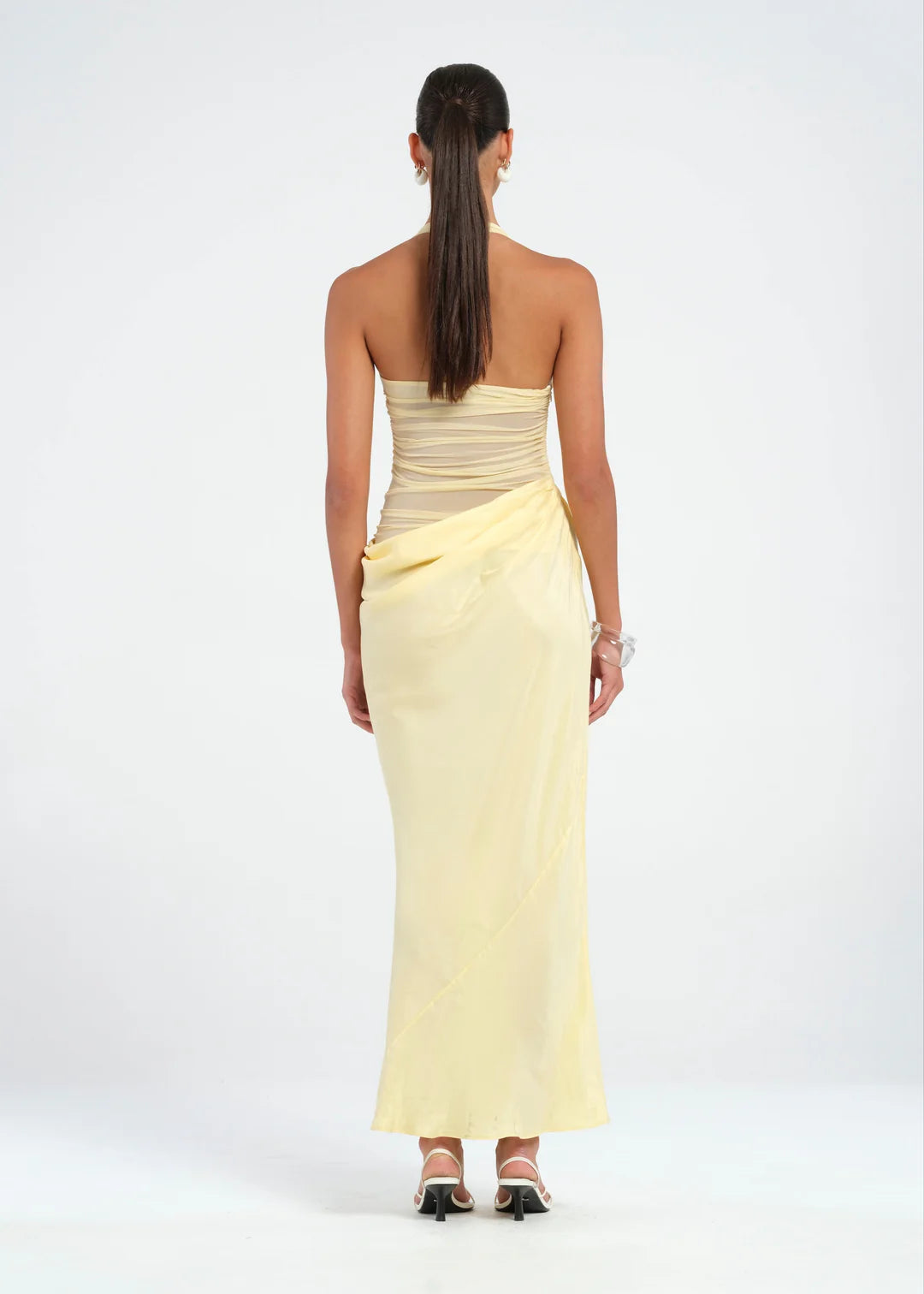 The Gina Maxi Dress is the perfect summer update of our popular Yasmin Maxi Dress. The halter mesh top adds a touch of elegance, while the gathers through the waist create a flattering silhouette. The cupro skirt features a stylish cowl on the wearers left side waist.