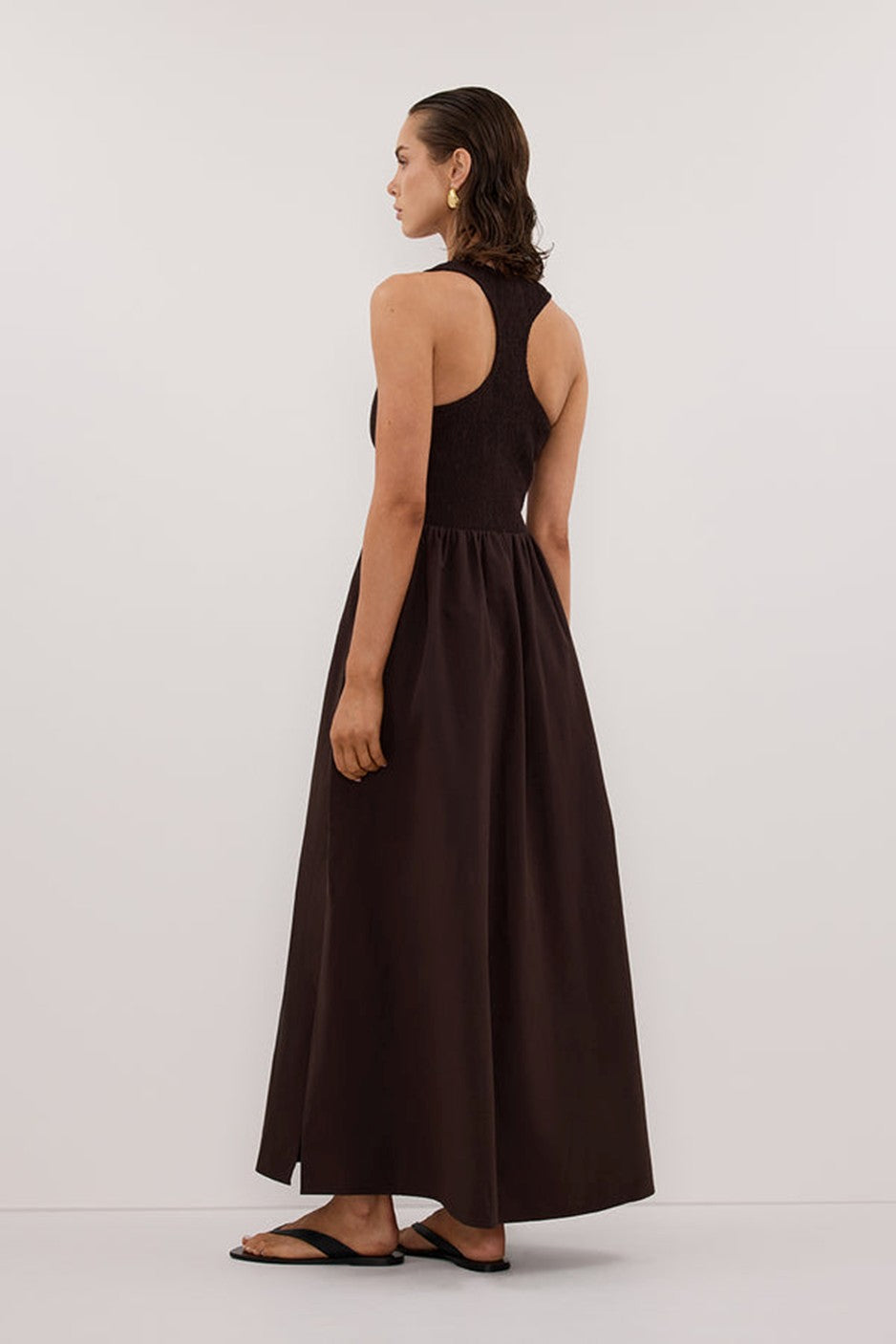 This sleeveless chocolate midi dress features a flattering scoop neckline, invisible side zip closure, and a racer-back design with wide straps. The peaked waist detail flows into a gathered circle skirt with a subtle side-seam split. Please refer to the studio images for the most accurate representation of colour.