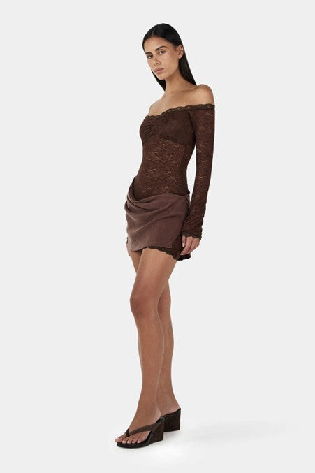 The Tahnee Mini Dress is a long-sleeve mini featuring a delicate lace underlay paired with a soft, draped cupro overlay. The dress is fully lined at the bust while remaining sheer through the waist and sleeves. Crafted from a high-stretch lace, designed to perfectly fit the body.
